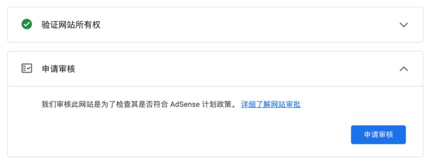 在 Adsense 后台添加一个新网站用于提审,有三种验证网站所有权的方式:1. 网站里安装 Adsense 广告 js 代码;2. 网站根目录下增加一个 ads.txt 文件(注意不是 Ads.txt);3. 网站首页 meta 里增加一行代码。
